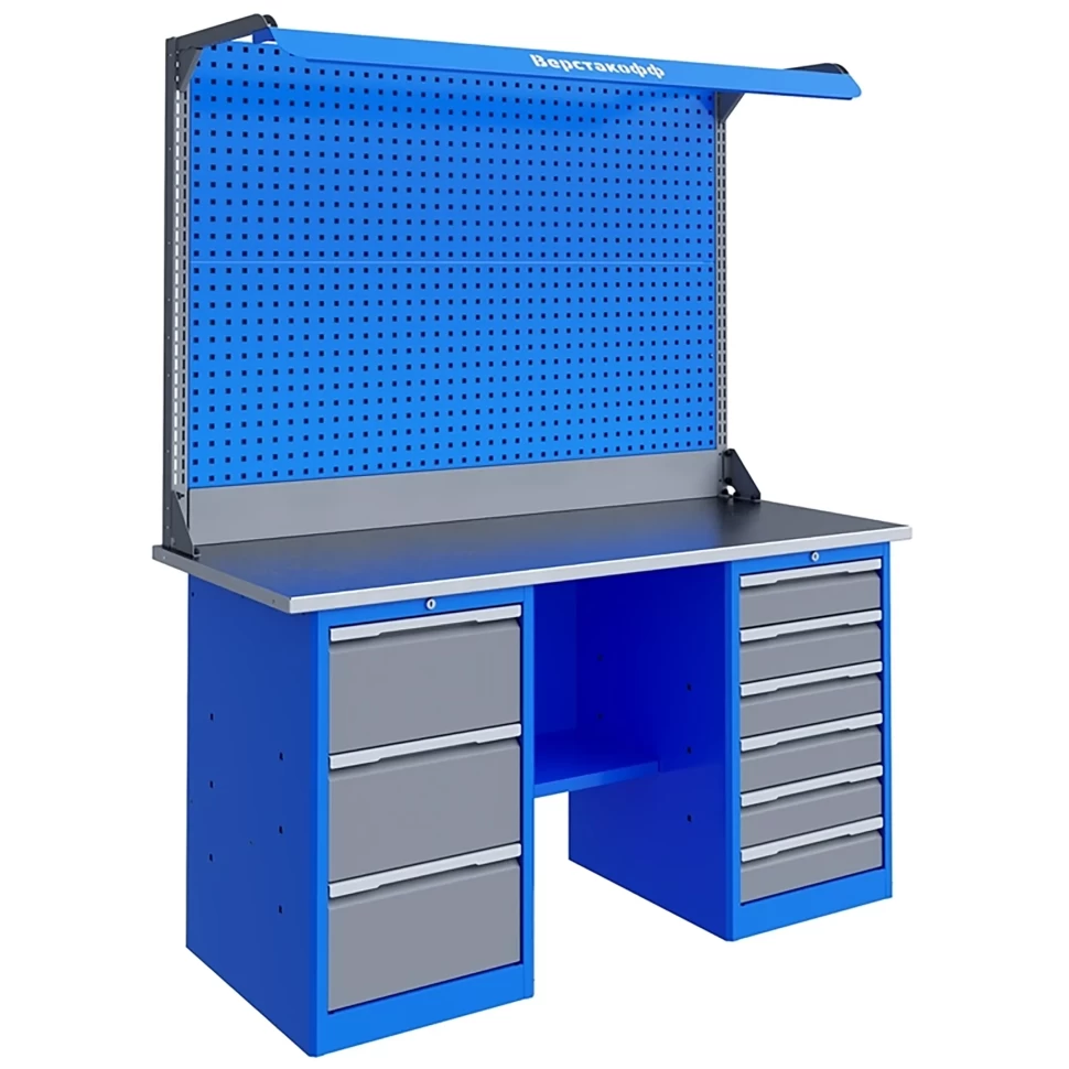 1Двухтумбовый слесарный верстак с экраном с нагрузкой до 1000 кг на столешницу.