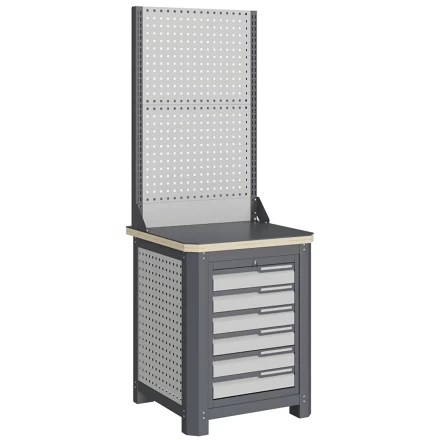 - состоит из столешницы шириной 693 мм, рамы верстака, состоящей из опор, перемычек, боковых перфопанелей, малого модуля S6;