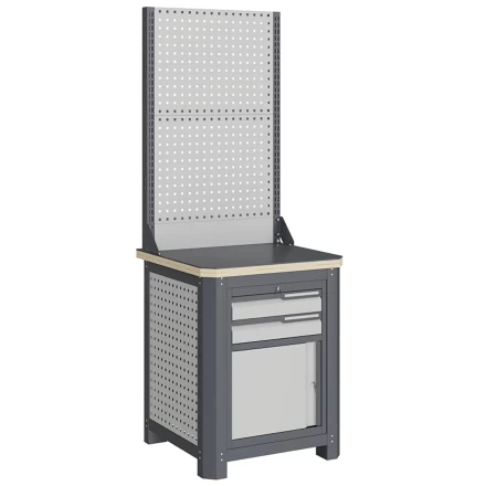 - состоит из столешницы шириной 693 мм, рамы верстака, состоящей из опор, перемычек, боковых перфопанелей, малого модуля S9;