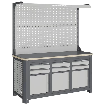 - экран (перфорированная панель) верстака выполнен с квадратной перфорацией 12х12 мм с шагом 38 мм для установки крючков, держателей и других аксессуаров;